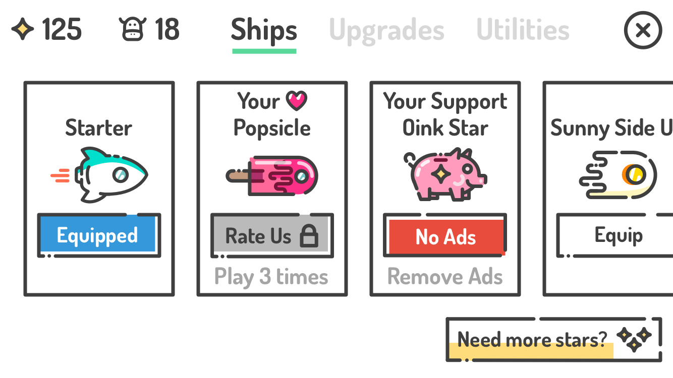 Finally the store allows players to customize their experience. From choosing a unique ship, to upgrading your boosters, and finally utilities to help you progress if you came across difficulties.