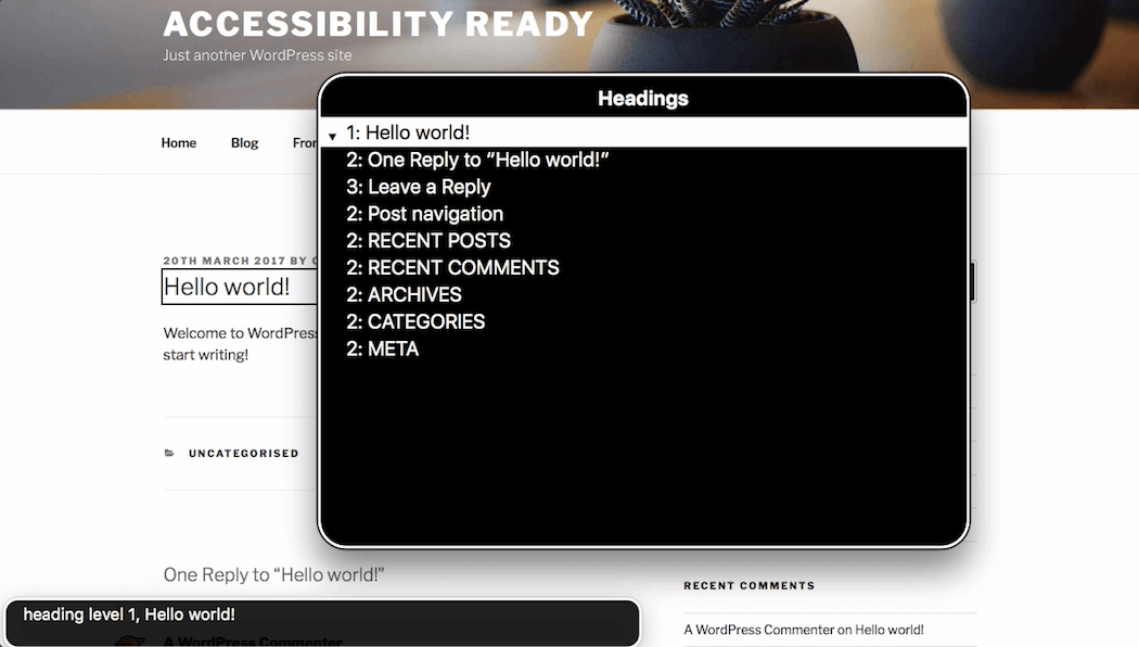 To sum up the experience of screen readers, you tab through elements of the page and the computer’s voice assistant reads the description, or labels (alt-text) on each page. Users can use shortcuts to go through specific items such as links or headings in the page to skim or jump to those sections.